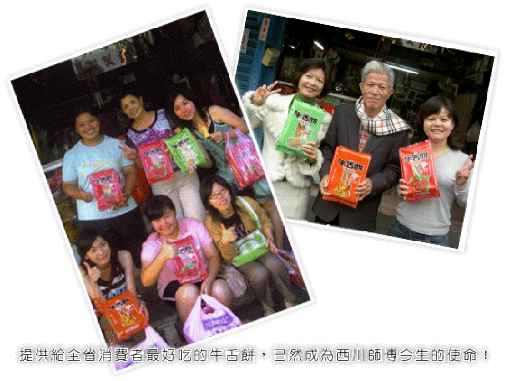 西川師傅所製作的東南牛舌餅,厚薄適中,口感獨特,為宜蘭縣內最能保有傳統香酥脆原味的道地牛舌餅。一打開牛舌餅包裝袋,濃濃的餅香立即撲鼻而來,而一口咬下牛舌餅時,酥脆的餅皮、濃郁的麥芽香隨即在嘴中漫延開來,香味久久不散。消費者常常會在試吃後,馬上脫口而出 ”哇!好久沒吃到這樣充滿舊時滋味的餅了!”,”新式的超薄牛舌餅,吃起來沒味沒素的,像是機器做的西式脆餅,只有你做的才是我們記憶中正港的宜蘭牛舌餅!”。而這些源源不斷的衷心肯定與讚美,正是西川師傅於宜蘭名產及糕點中,選擇全力專攻牛舌餅製作的最佳原動力。