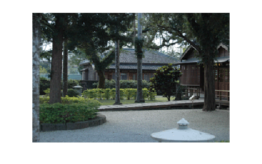 戶外庭園,小橋流水,花木扶疏。高大粗壯的大樟樹,與官邸建築相映成趣。